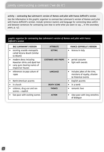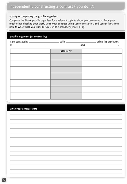 How to write what you want to say … in the secondary years: student workbook is full of activities for students to practise deconstructing and constructing texts that demonstrate writing skills. Through repeated exposure to fit-for-purpose graphic organisers and sentence starters and language for connecting ideas within and between sentences, students become confident writers.